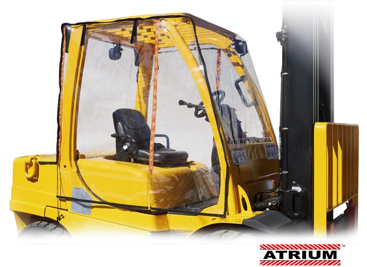The Original Atrium “Full Forklift Cab Enclosure” by Eevelle – This is a perfect item for those foul weather days in or out of the warehouse. The Atrium attaches in seconds and fits to any forklift. Zippered doors can be shut or unzipped and folded back while working. Perfect for rainy days so you have the ability to keep working while staying warm and dry! Great for the yard and warehouse.