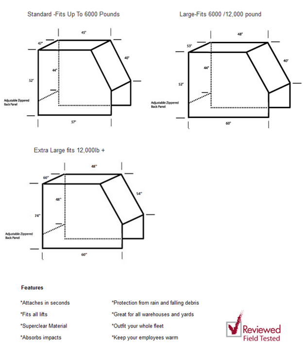 -attaches in seconds to any forklifts. This cover is made of a clear material so you can safely operate your forklift while your operator is protected from weather, wind, dust, rain etc. Zippered doors can be shut or unzipped and folded back into place while working. Perfect for those rainy days so you can still work warm and dry.